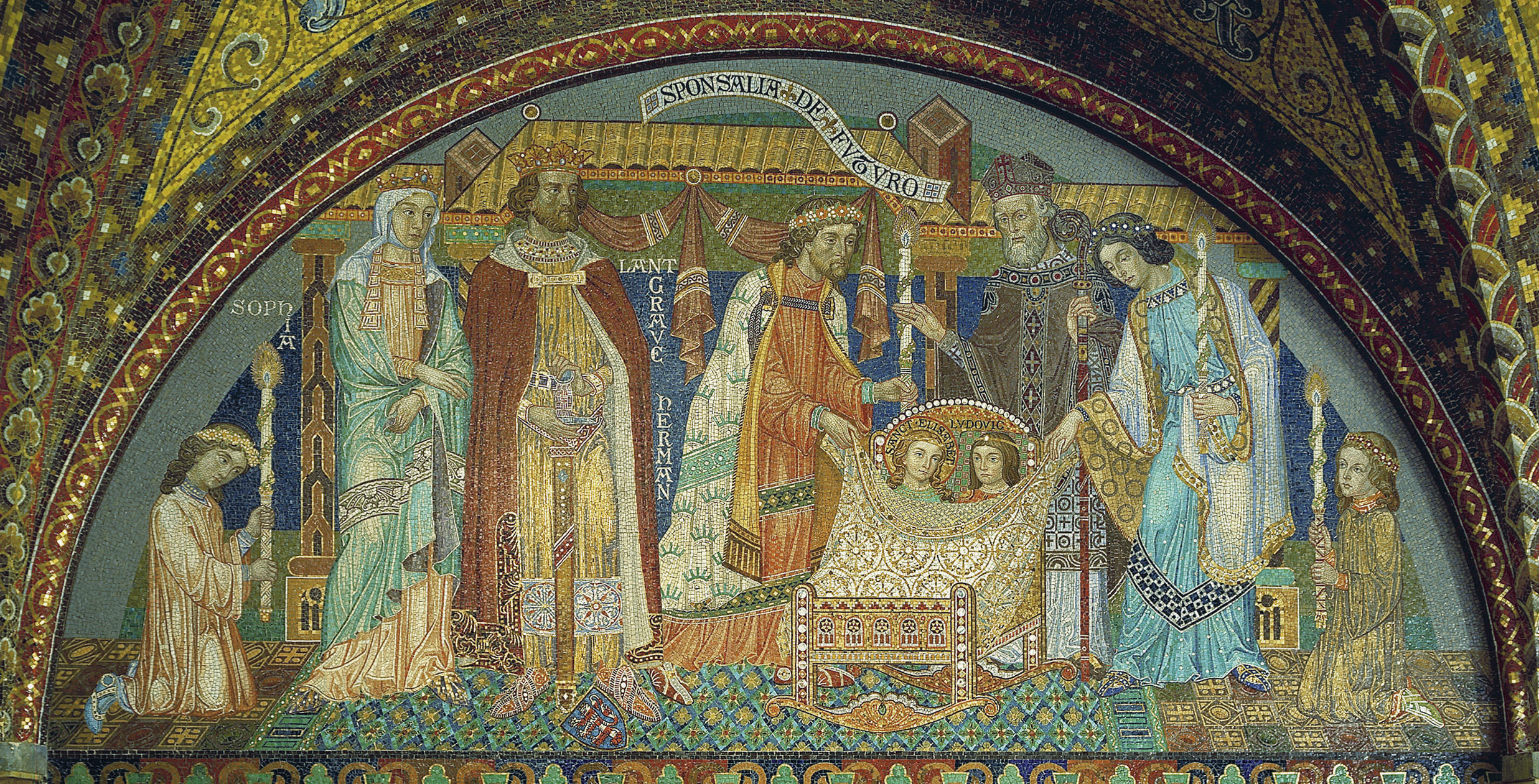 Mit sechs Jahren verlor die ungarische Prinzessin Elisabeth ihre Mutter. Diese hatte zwei Jahre vorher ihre erst vier Jahre alte Tochter nach Thüringen gegeben, damit sie später Landgräfin von Thüringen werden sollte. Nicht ganz klar scheint dabei aber zu sein, wenn man die vielen Berichte über die damalige Zeit überprüft, wer denn eigentlich ihr Bräutigam werden sollte. Landgraf Hermann I. hatte mit seiner Gemahlin Sophia von Baiern, es war seine zweite Frau, vier Söhne und zwei Töchter. Im Jahr der Hochzeit wurde 1196 Irmgard geboren. Dann war Landgraf Hermann einige Zeit auf Reisen, deshalb kam als nächster Ludwig am 28. Oktober 1200 zur Welt. Hermann war 1202 der zweitgeborene Sohn und danach kam 1204 Heinrich Raspe. Hier kann wohl das öfter in den Chroniken genannte Geburtsjahr 1201 nicht stimmen. Im Jahre 1205 hatte Sophia die Agnes bekommen und 1206 oder 1207 den Konrad als letzten der 4 Söhne. Warum nur von Ludwig das genaue Geburtsdatum bekannt ist, verwundert etwas. Noch verwunderlicher ist, dass von einigen Chronisten der Hermann als der Erbprinz und Erstgeborene genannt wird, mit dem Elisabeth verlobt worden war. In der Elisabethkemenate wird Elisabeth jedoch mit Ludwig verlobt. (siehe Bild) Die ungarische Königstochter wuchs jedenfalls in dieser Thüringischen Fürstenfamilie zusammen mit Agnes und Konrad unter fast Gleichaltrigen sicher wohlbehütet auf.