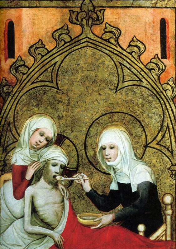 Zu dem Bild ein kurzer Hinweis. Es ist ein Ausschnitt aus dem linken Altarflügel des Elisabethaltars, Köln 1380/90, Tempera auf Tannenholz, Köln, Wallraf-Richartz-Museum. Repro aus dem Buch: "Elisabeth von Thüringen" des Michael Imhof Verlages.