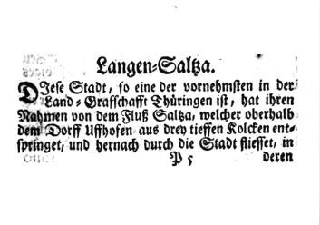 Weichbild er 21. Mühlen treibet, und darauf in die Unstrut lauffet. Sie wird gemeiniglich Langen=Saltza genennet, zum Unterschied der Stadt Grossen-Saltza im Stift Magdeburg, und Saltza der Helden bey Einbeck im Fürstenthum Grubenhagen, wie auch anderer Oerter, welche sonst diesen Namen führen."