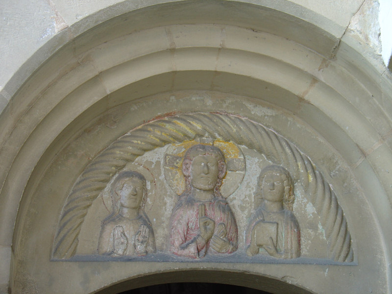 Romanisches Tympanon aus dem späten 12. Jahrhundert als Erinnerung an die Grabeskirche in Jerusalum.