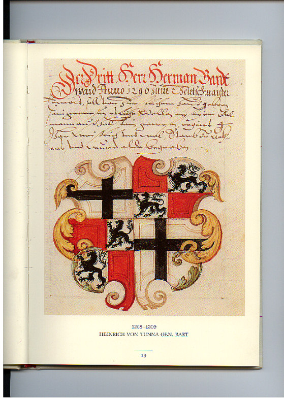 “Von dem, was in den ersten zehn Jahren des neu gegründeten Deutschen Ritterordens geschieht, ist nur wenig überliefert. Drei Meister des Ordens sind bekannt: Nach Heinrich Wapot übernimmt Otto von Kerpen das Amt, dem Heinrich Bart folgt. Man weiß nicht, in welchem Jahr die drei jeweils gestorben sind, man weiß aber die Todestage. Woher sie stammen, ist unbekannt. Heinrich Bart kommt wahrscheinlich aus Thüringen, hat im Jahre 1208 eine Pilgerfahrt ins Heilige Land unternommen, tritt in den Orden ein und wird alsbald zum Ordensmeister gewählt. Gestorben ist er am 2. Juni 1209 oder 1210 und wird - wie wahrscheinlich auch seine beiden Vorgänger - in Akkon begraben." Soweit Dieter Zimmerling in seinem Buch " Der Deutsche Ritterorden". Der hat das dem Buch "Hermann von Salza" von Adolf Koch entnommen, der schreibt: "dass seit Heinrich Bart - mit zwei Ausnahmen - nur Sachsen und Thüringer siebzig Jahre lang mit der höchsten Würde des Ordens geschmückt wurden,...". Es gibt jedoch noch andere Namen, die bei den verschiedenen Chronisten für den 3. Hochmeister des Deutschen Orden genannt werden. Beda Dudik nennt ihn 1858 Hermann Bart, auch Willy Cohn läßt im Juni 1210 einen Hermann Barth sterben. In vielen neueren Werken über den Deutschen Orden ist jedoch die Rede von Heinrich von Tunna genannt Bart, der von 1208 bis 1209 oder 1210 Hochmeister des Deutschen Ordens war. In der Festschrift zum 200jährigen Jubiläum der Kirche St. Petri und Pauli von Guido Reinhart, Rektor in Gräfentonna, kann man 1892 lesen: "Nach dieser Zeit verkaufte ein gewisser Heinrich von Tonna dem Kloster Reinhardsbrunn 150 Acker Holz auf dem Eytersberge bei Tonna, d. i. das Klosterholz auf der "Fahnerschen Höhe", die noch im 17. Jahrhundert den Namen Eytersberg führte. Wer dieser Heinrich von Tonna gewesen, der ein so bedeutendes Besitztum (im Jahre 1208) verkaufte, hat nicht festgestellt werden können". Wenn man den Stammbaum der Herren von Gleichen und von Tonna durchsucht, findet man für diesen Zeitraum keinen Heinrich. Man findet aber einen Hermann und vor allem einen Bardo?, Brüder des Erwin von Gleychen, der gemeinsam mit Walther Wigand Buchardus von Salza 1162 Zeuge auf einer Urkunde für das Kloster Homburg war. Und wenn man dazu noch weiss, dass die Schwester des Vaters dieser Brüder, Beatrice mit dem Henneberger Graf Boppo II. verheiratet war, besteht die große Wahrscheinlichkeit, dass beim Besuch in Thüringen Otto von Botenlauben(Henneberg), seinen Verwandten Bardo von Tonna zu der Pilgerfahrt animiert hatte.